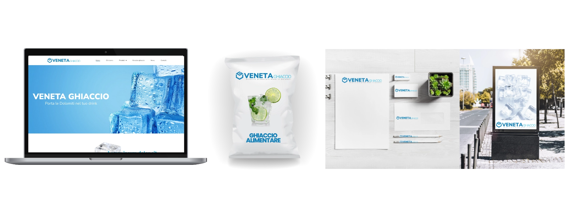 Una volta stabilito il nome, siamo passati alla costruzione dell’identità del brand, esaminando attentamente ogni aspetto – dai colori e i font, fino ai minimi dettagli della comunicazione visiva. Questo ci ha permesso di creare un brand coeso e riconoscibile, che riflette appieno la missione e i valori di Veneta Ghiaccio.